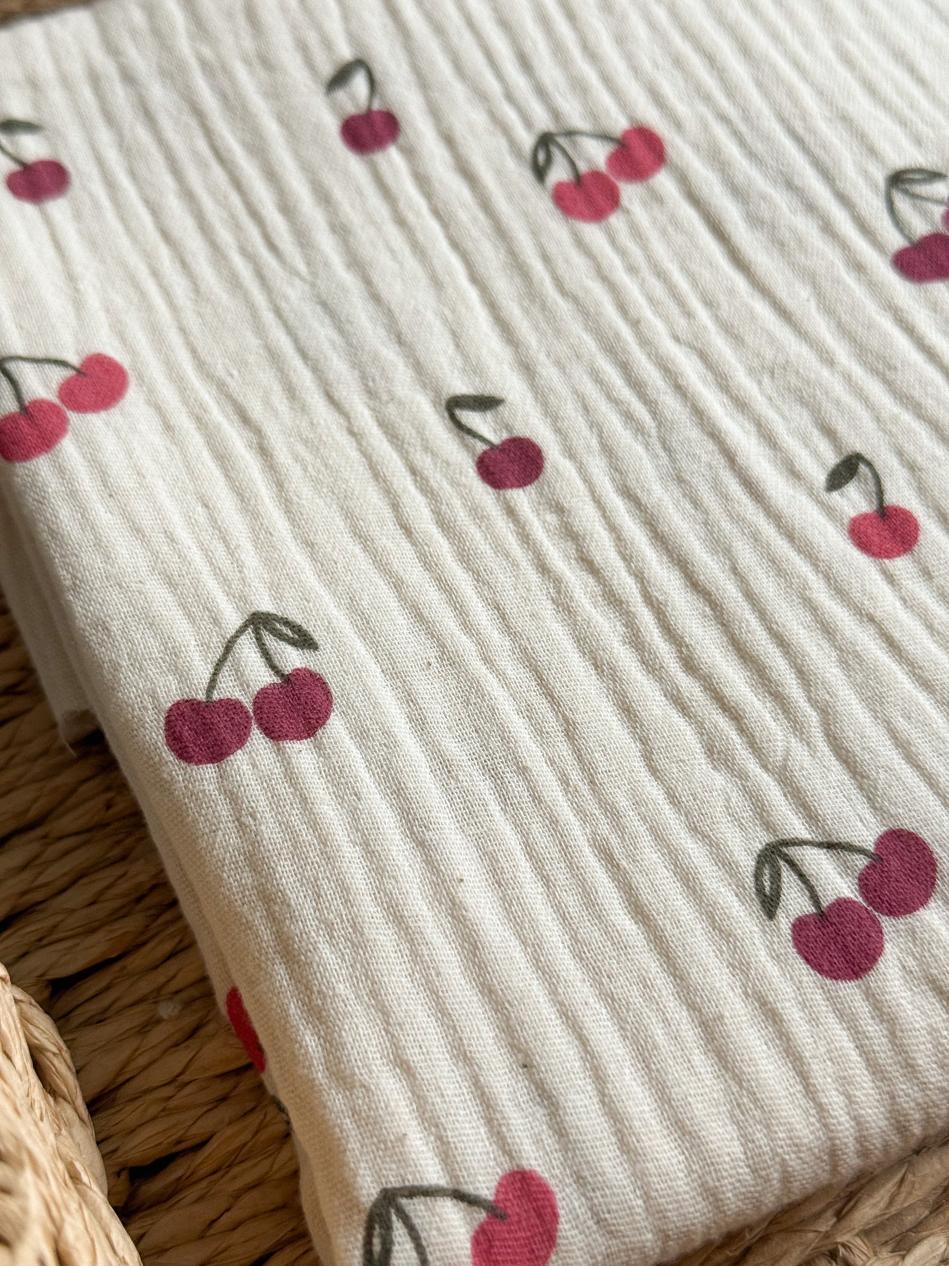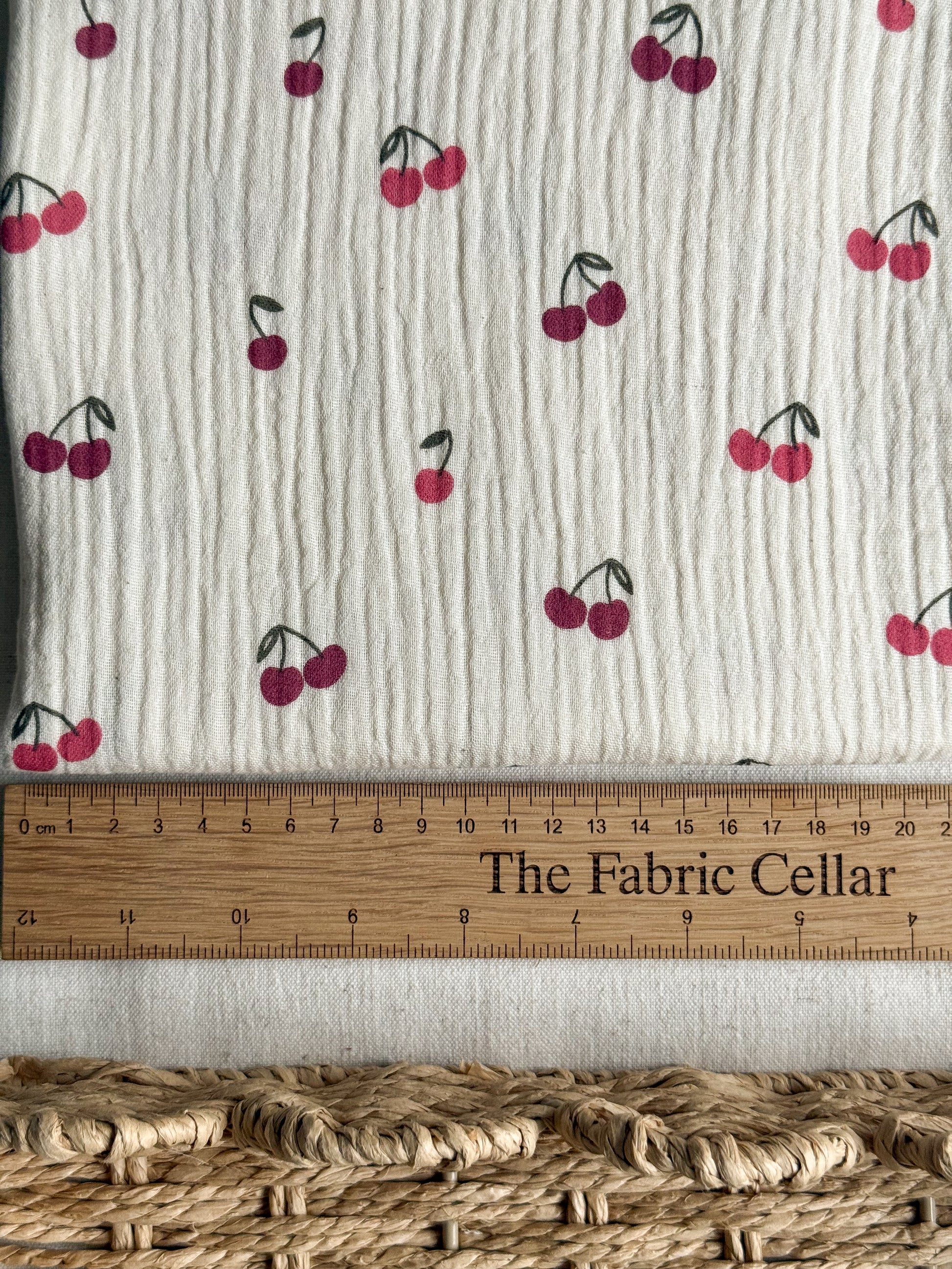 A cute natural double gauze fabric with cherry print. It's lovely and soft and lightweight, perfect for floaty garments like dresses, blouses and childrenswear.