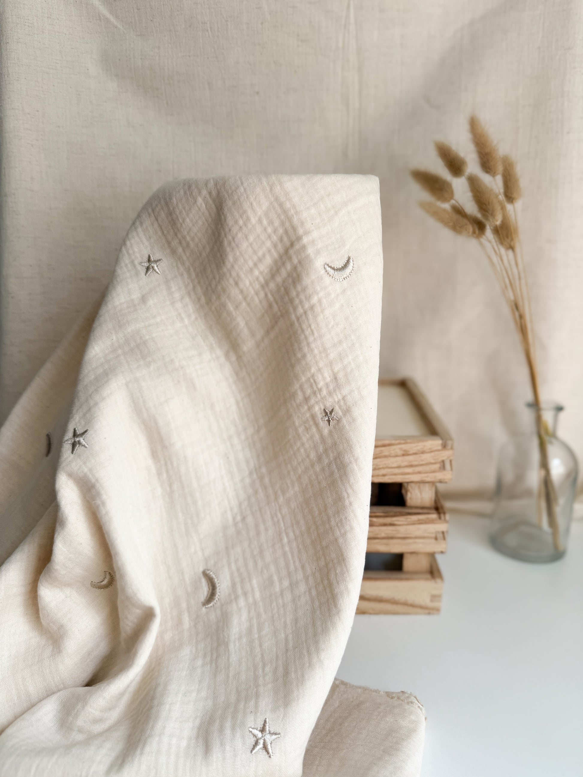 A beautifully soft embroidered double gauze fabric in a natural colour with a lovely silver moon embroidery. We absolutely love embroidered fabrics as they add texture and another dimension to your sewing projects!