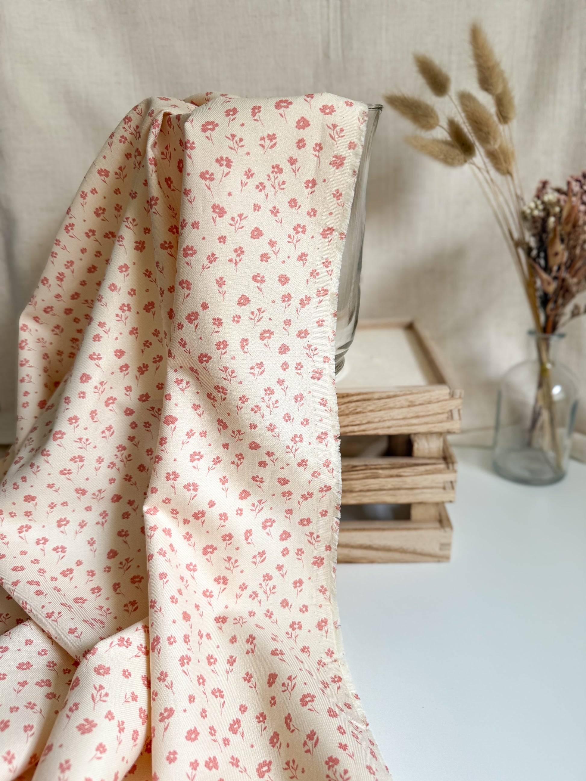 A gorgeous fine and lightweight organic cotton twill fabric with a pretty rose coloured print on a warm cream background. Great for sewing bags, accessories, trousers, shirts and home textile projects.