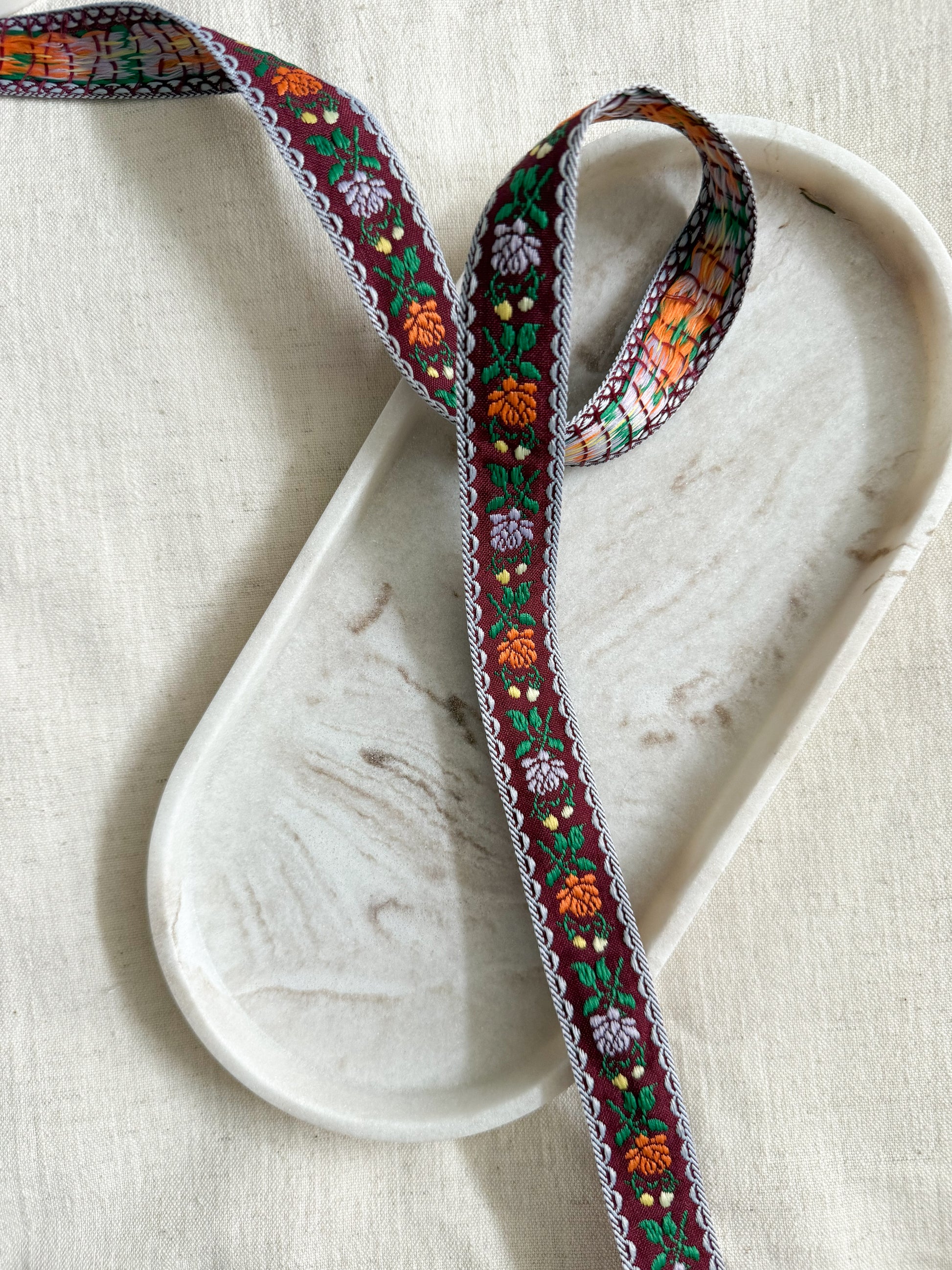 A lovely traditional floral trim in burgandy, with orange and lilac roses, measuring approximately 23mm wide. Perfect for sewing finishing touches to garments, adding to craft projects, making hair accessories and perhaps adding to dolls clothing!