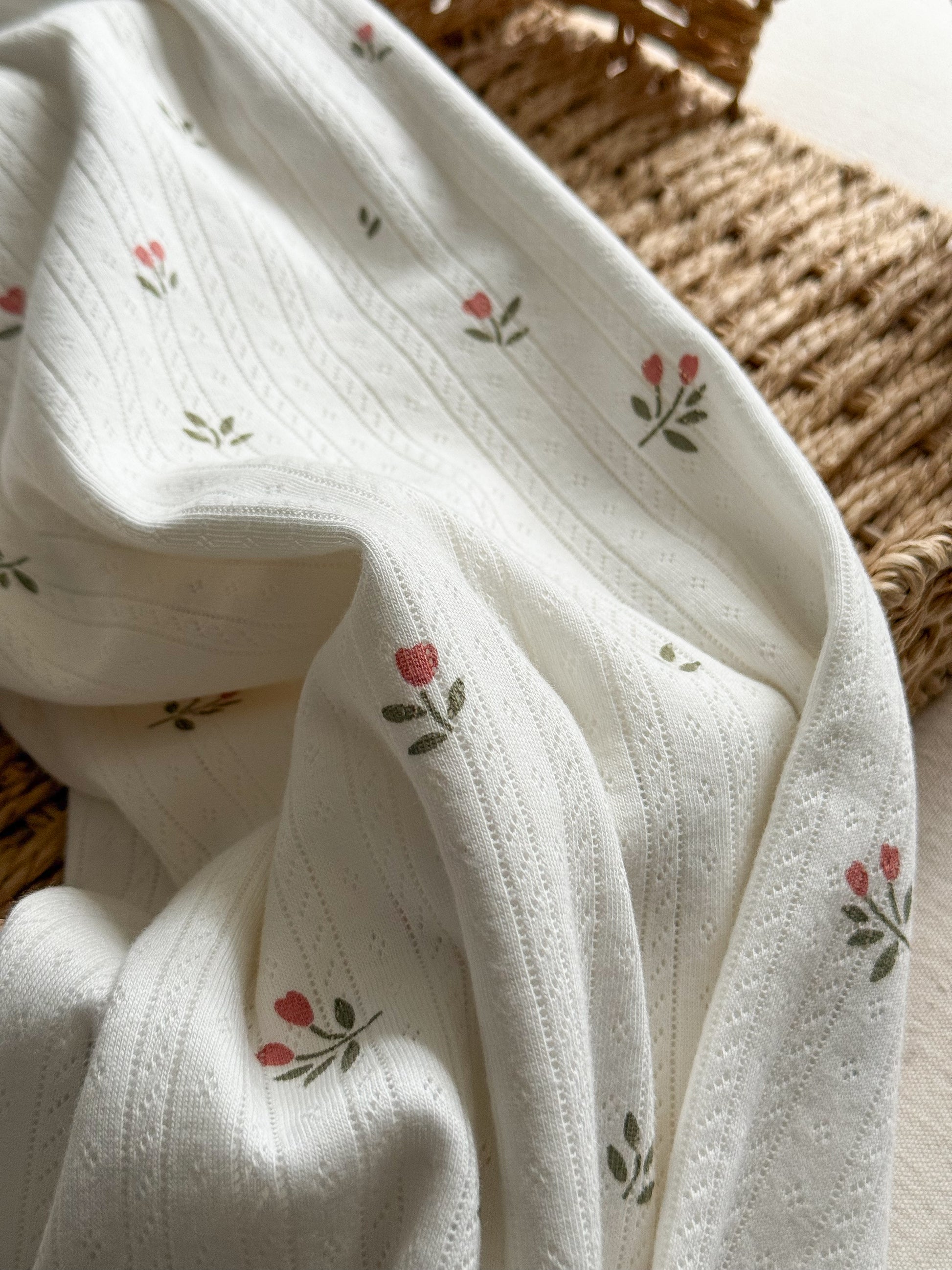 A soft and lightweight knit jersey pointelle fabric with an openwork base and a lovely print with soft pink flowers. Perfect for sewing t-shirts, dresses, pyjamas, camisoles and baby clothing and accessories.