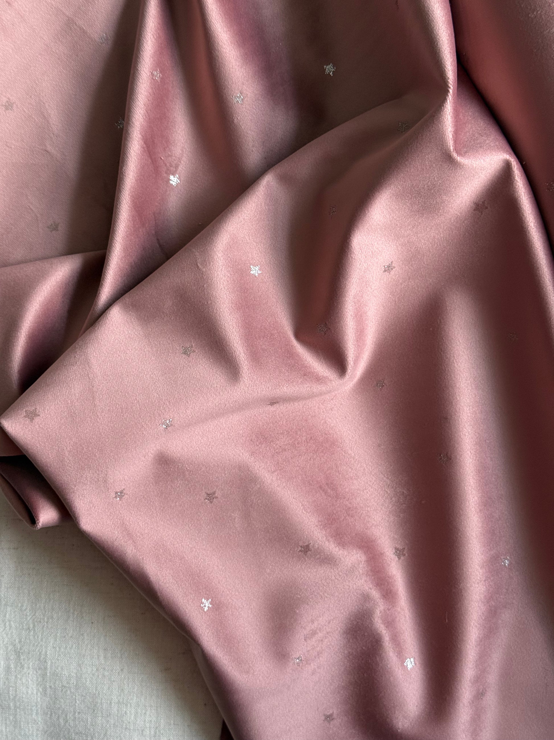 Beautifully soft, high quality short pile velvet which has a gorgeous drape. Sprinkled with delicate silver stars on an old rose coloured base with a subtle sheen. Produced in small quantites in Europe.